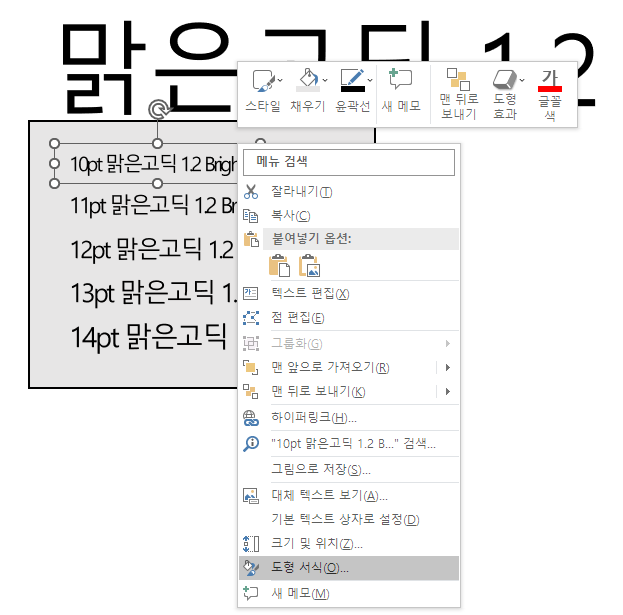 글씨 외곽선을 줘야 글씨가 조금더 조밀하게 보여진다. 글자 박스를 선택하고 마우스 오른쪽 버튼을 클릭해서 "도형서식"을 선택한다.