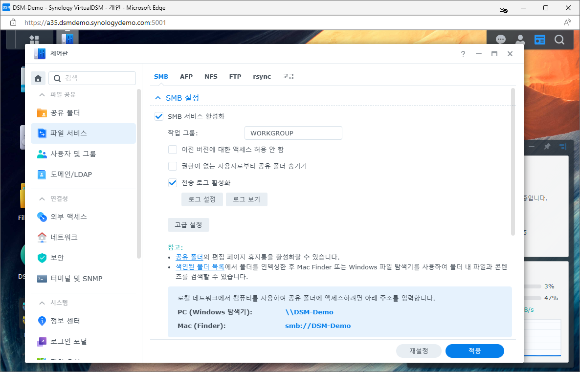 제어판 > 파일 서비스 > SMB를 설정 사실 다른건 설정 안해도 무방하다.