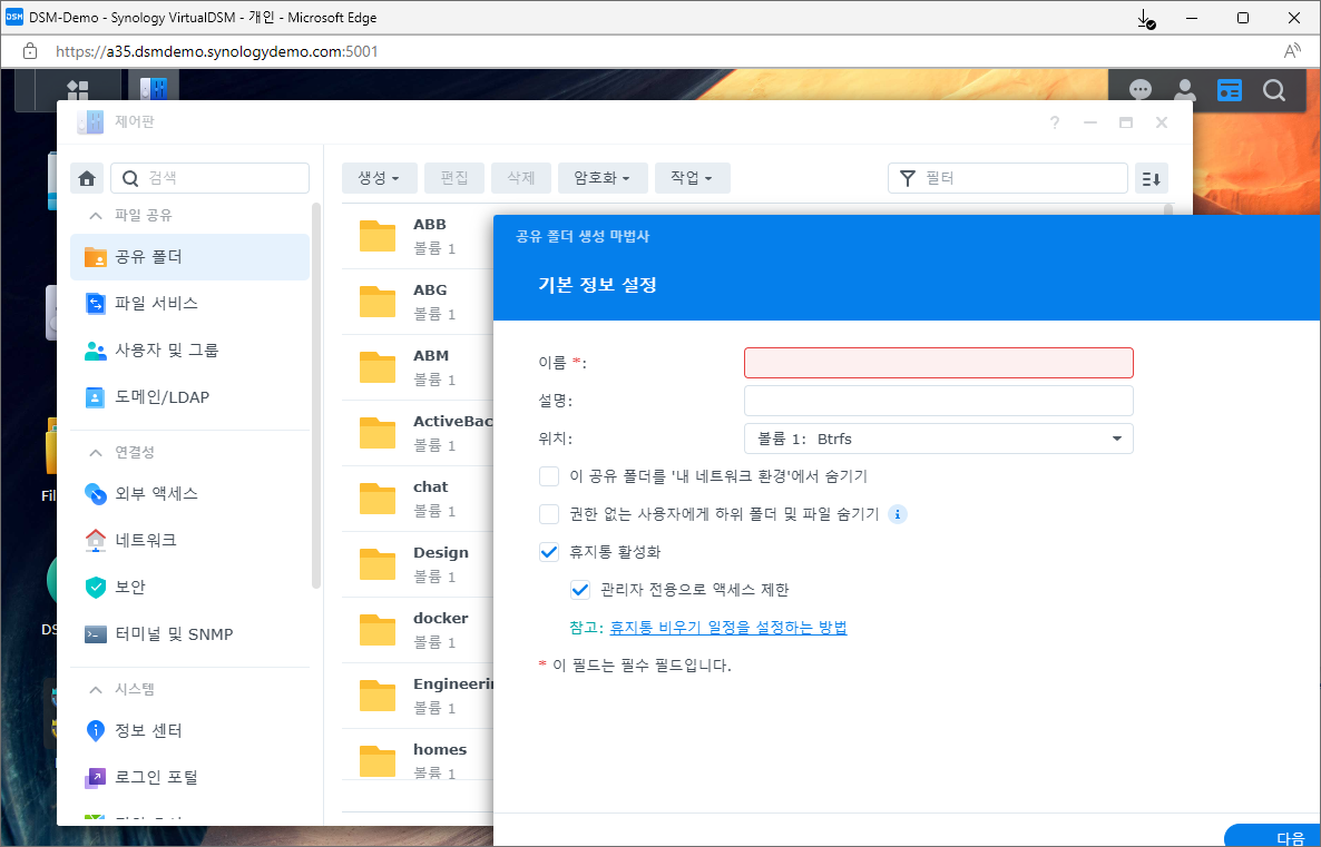 제어판 > 공유폴더 >생성 하고 진행하면 되는데 백업을 하긴 하더라도 휴지통을 활성화 시켜놓고 일정시간 이후에 지나면 삭제 되도록 설정해도 좋다. 난 30일을 기준으로 삭제 하도록 해놨다.
