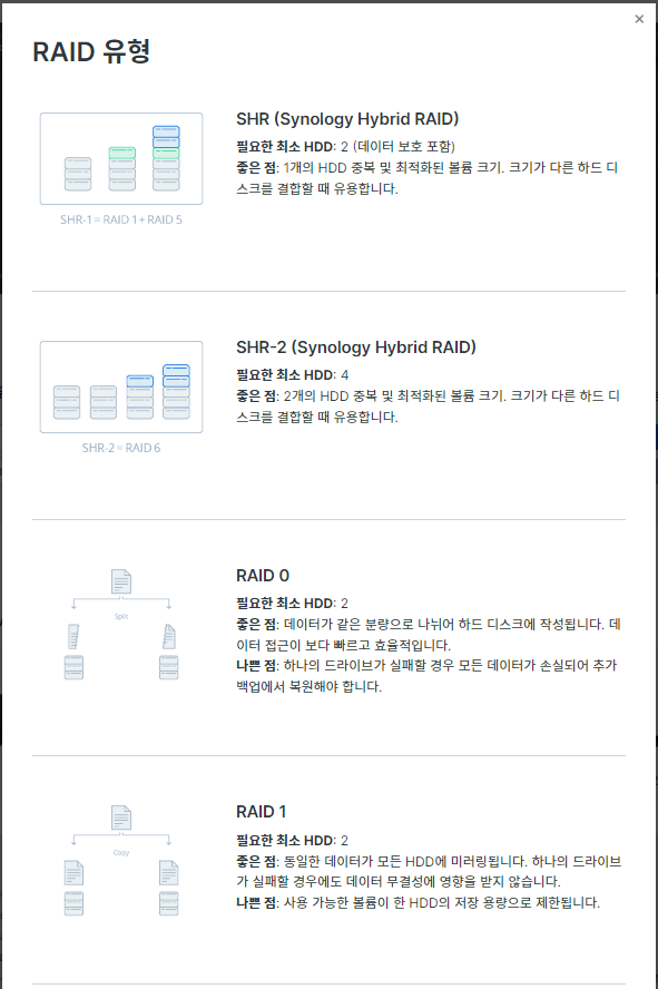 하드 용량이 똑같지 않다면 SHR이 저장에 유리하고, RAID방식은 사용하지 않는 공간이 많아진다.