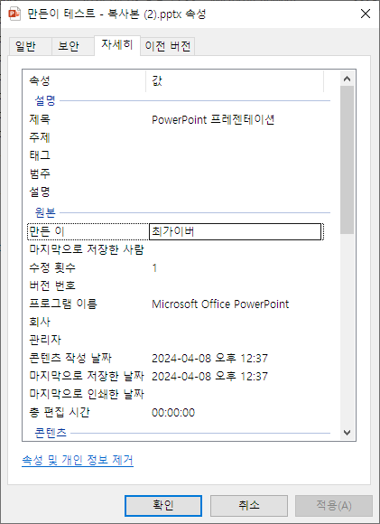 2. 속성 창의 탭 메뉴 "자세히"를 클릭 원본의 "만든 이" 오른쪽 이름 클릭 하면 됩니다.여기서 백 스페이스 키를 눌러 삭제해도 되고 "확인" 클릭하면 수정이 됩니다.