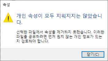 파일이 열려 있다면 다음과 같은 메세지 나오니 종료 후 시도하세요. 물론 이런 메세지 나와도 해당 문서 외에는 속성이 지워집니다.