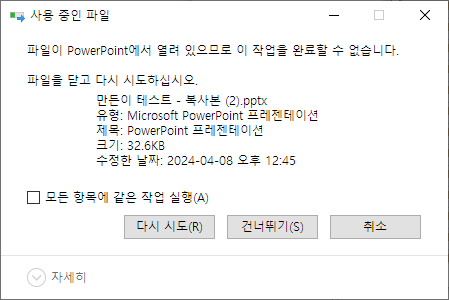 파일이 열려 있다면 다음과 같은 메세지 나오니 종료 후 시도하세요. 물론 이런 메세지 나와도 해당 문서 외에는 속성이 지워집니다.