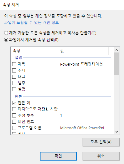 3. "파일에서 제거할 속성 선택" 을 선택하고 하단의 "만든 이" 항목 체크 하고 "확인" 클릭