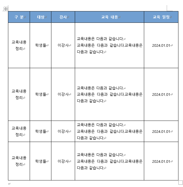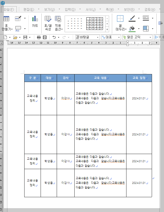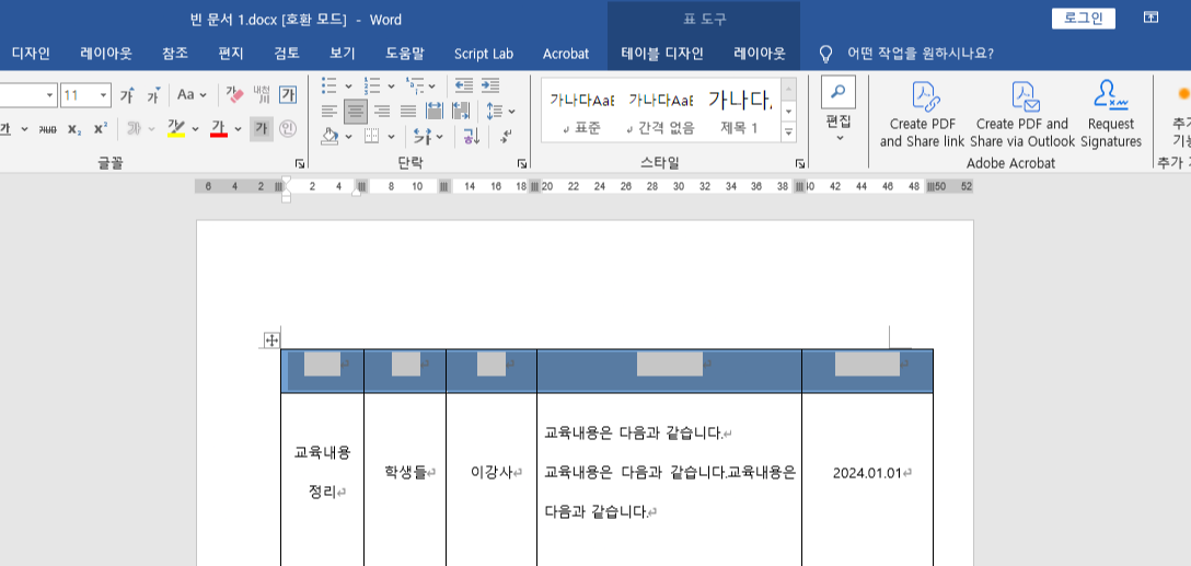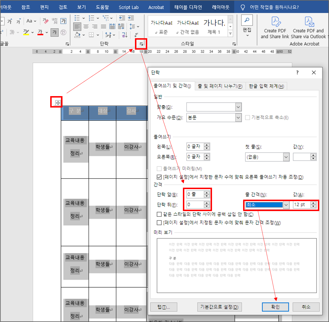 그리고 다 적용이 되었다면 표를 선택해서 "단락" 앞뒤 값을 0으로 하고 줄간격을 최소나 1줄 정도로 해서 적용하고 표를 전체 클릭한 상태에서 F4를 누르고 똑같이 반복하면 됩니다.