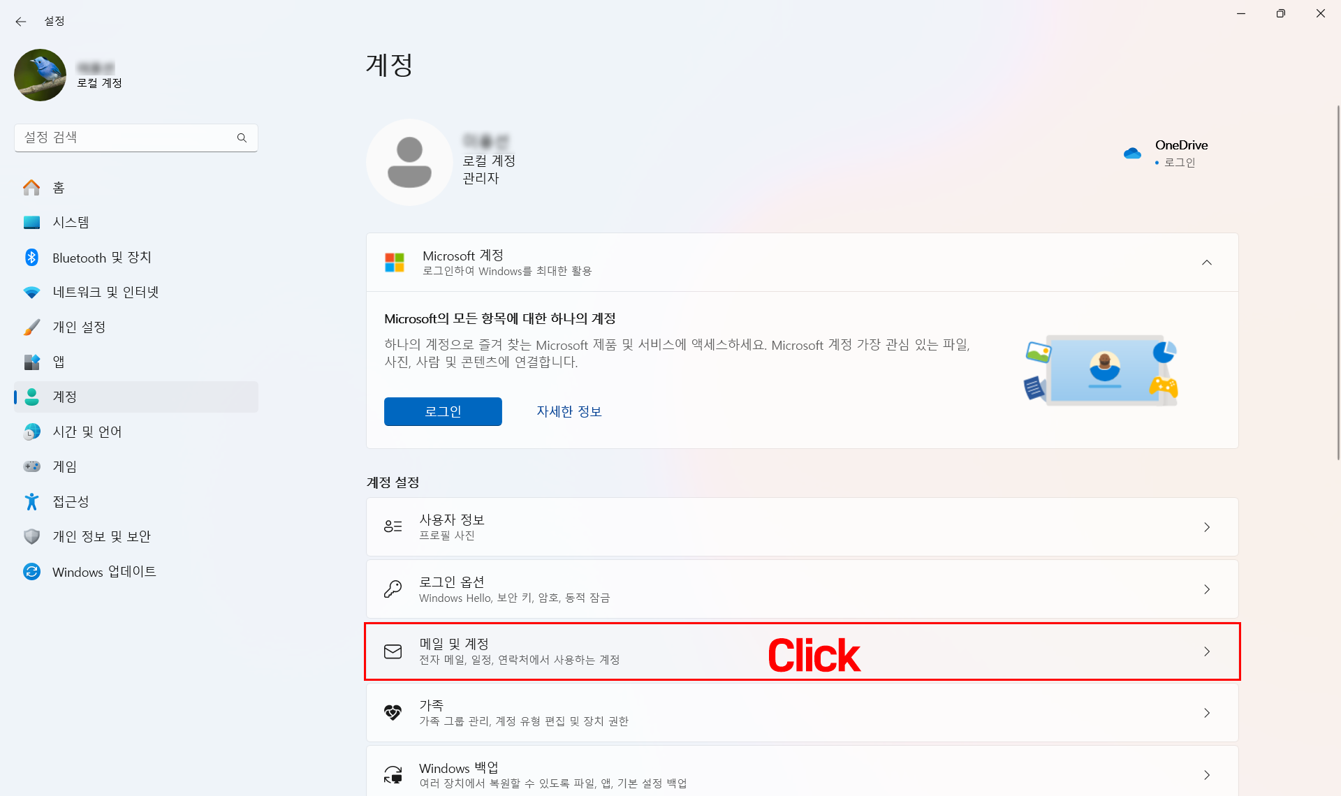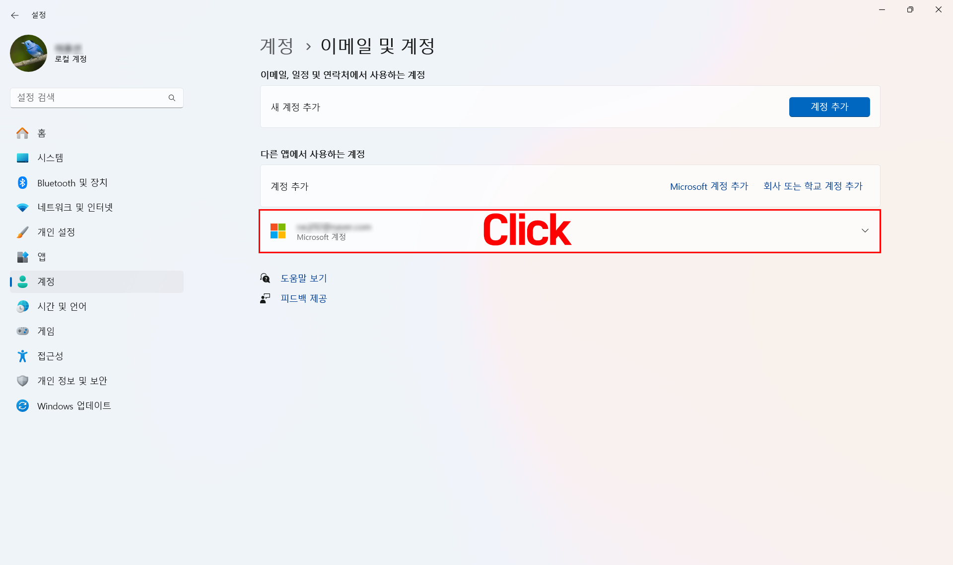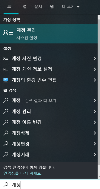 키보드에서 윈도키를 눌러서 '계정'이라고 입력만 하면 됩니다. 엔터!