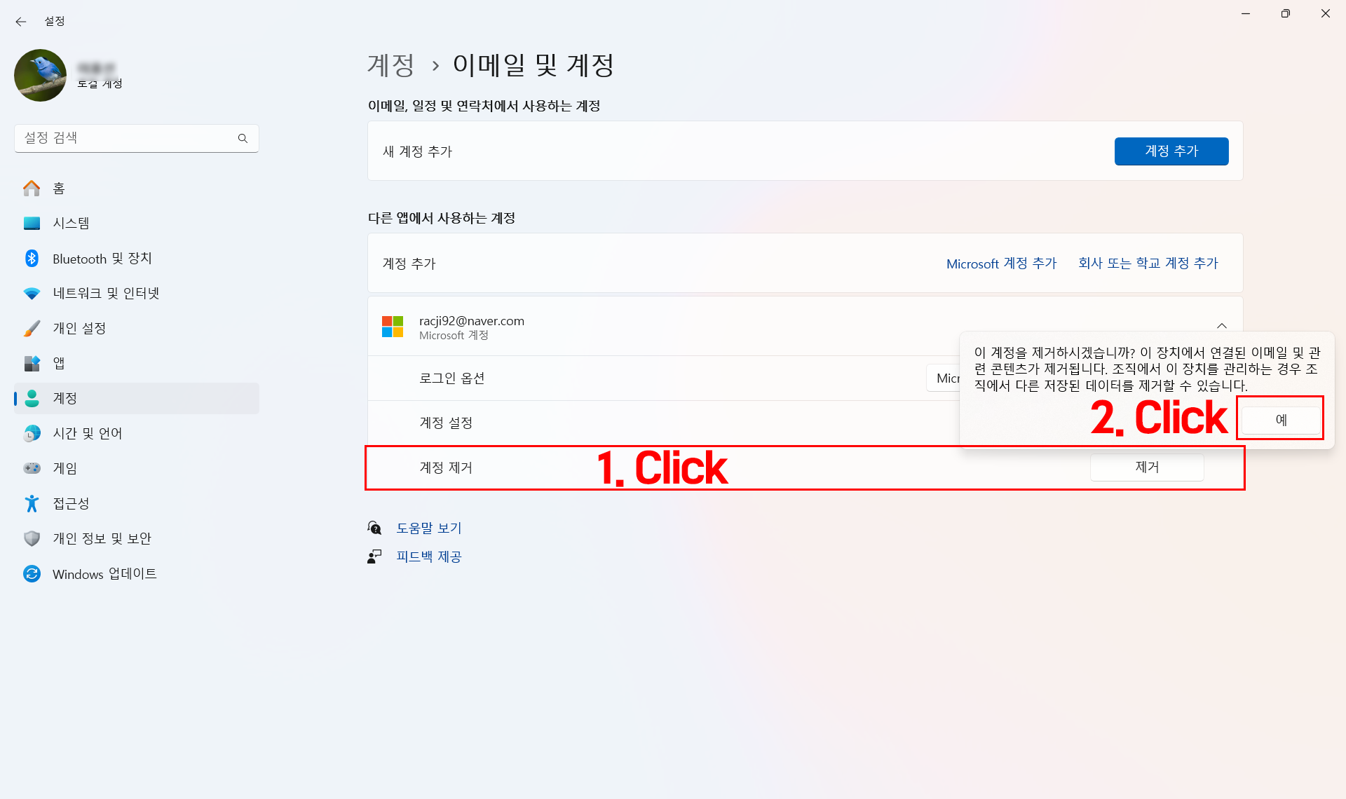 아래와 같이 로그인옵션, 계정설정, 제거가 나오는데 제거를 클릭하면 팝업창 나오면서 "예"를 클릭하면 됩니다.