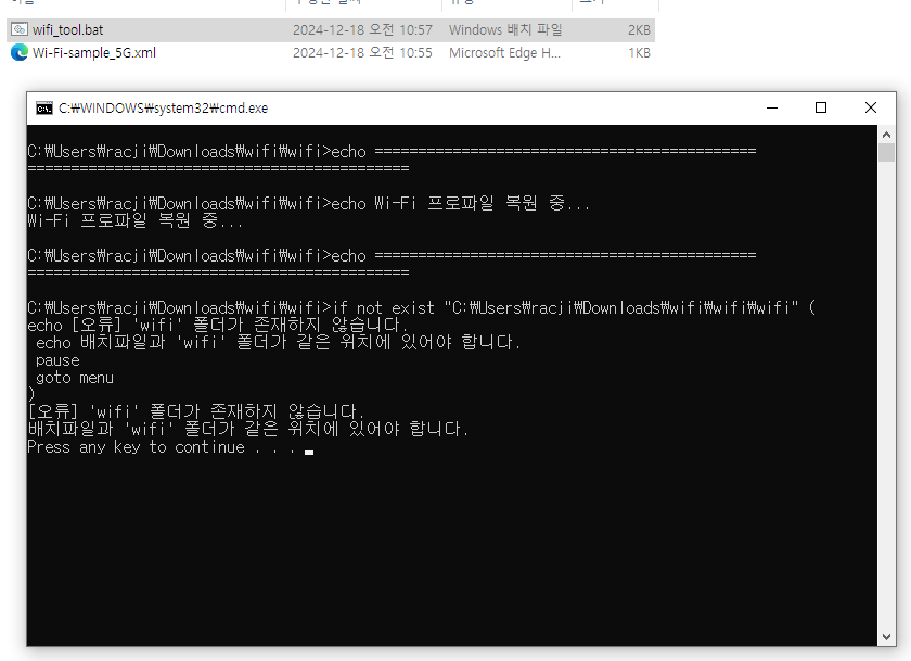 2. 복구 > bat파일과 wifi폴더가(폴더 안에가 아님) 같은 디렉토리(위치)에 있어야 한다.