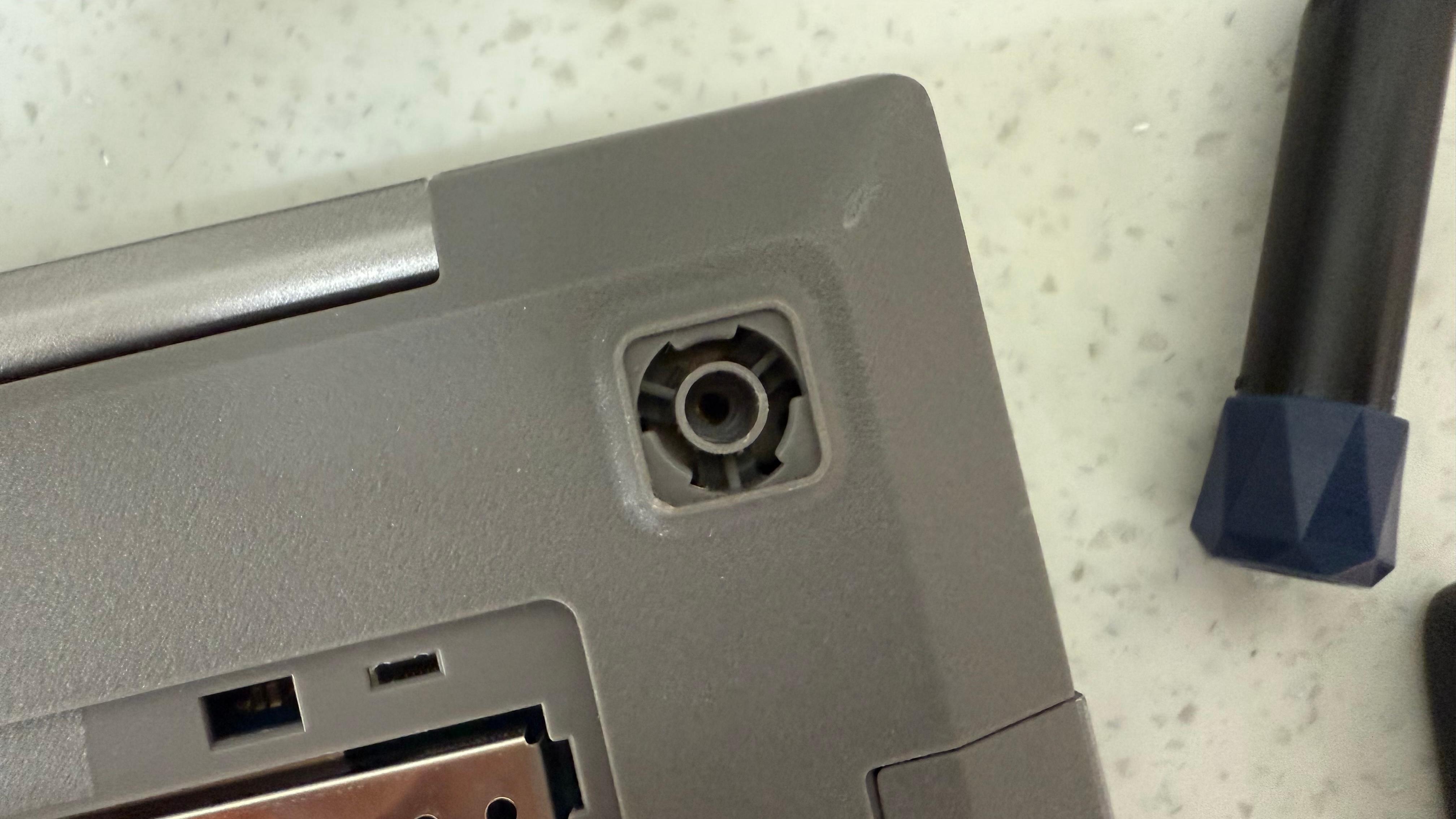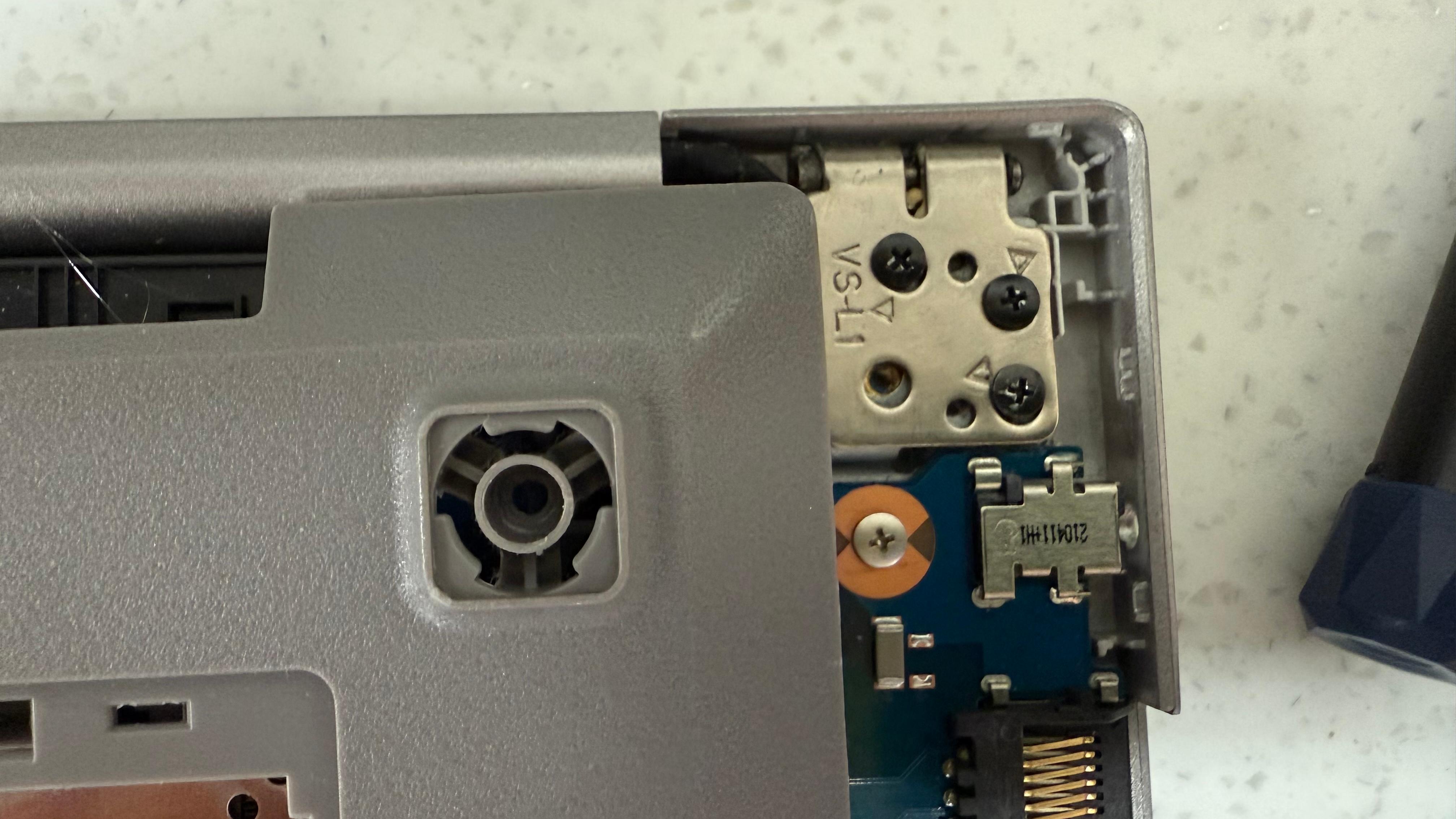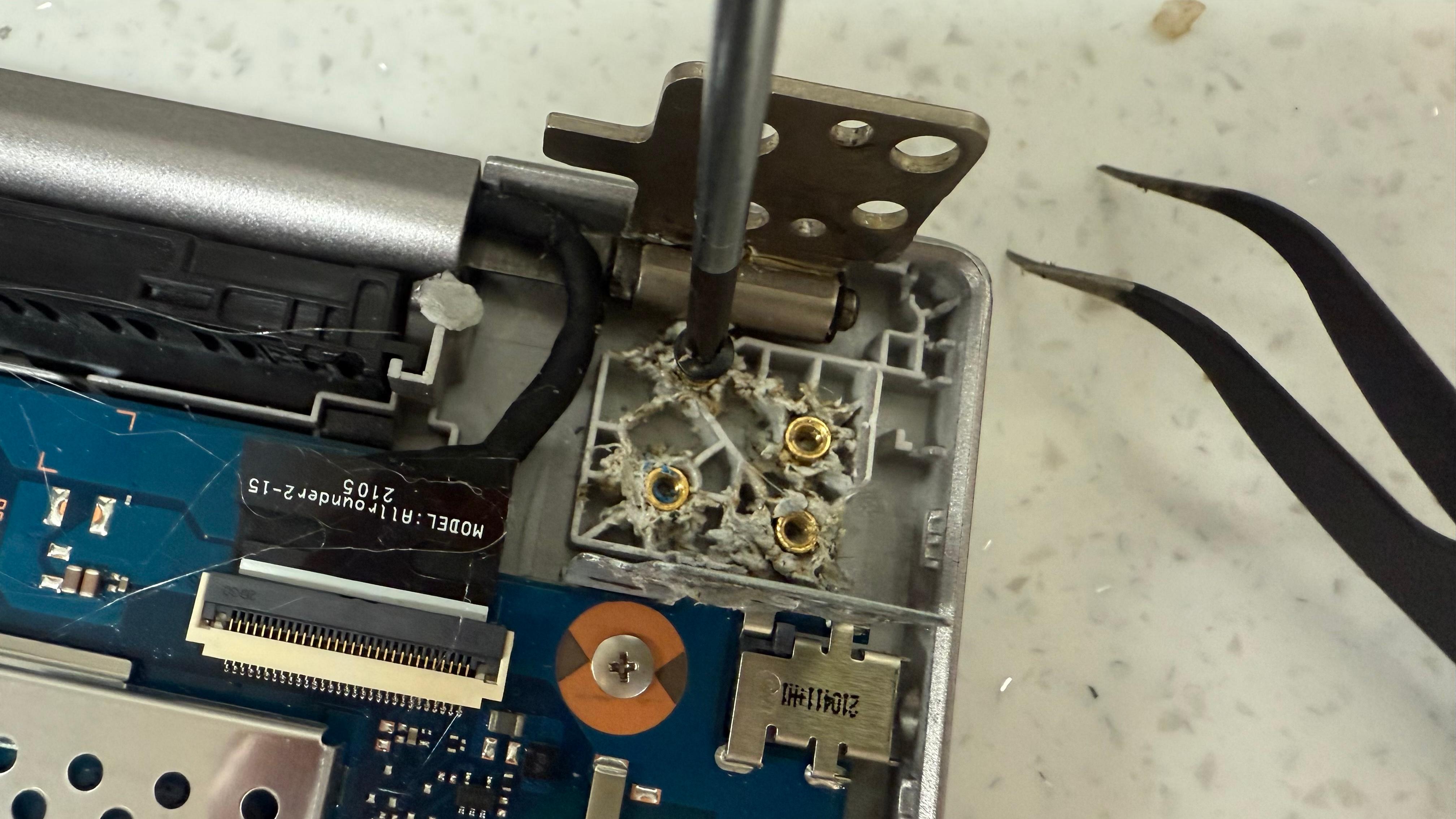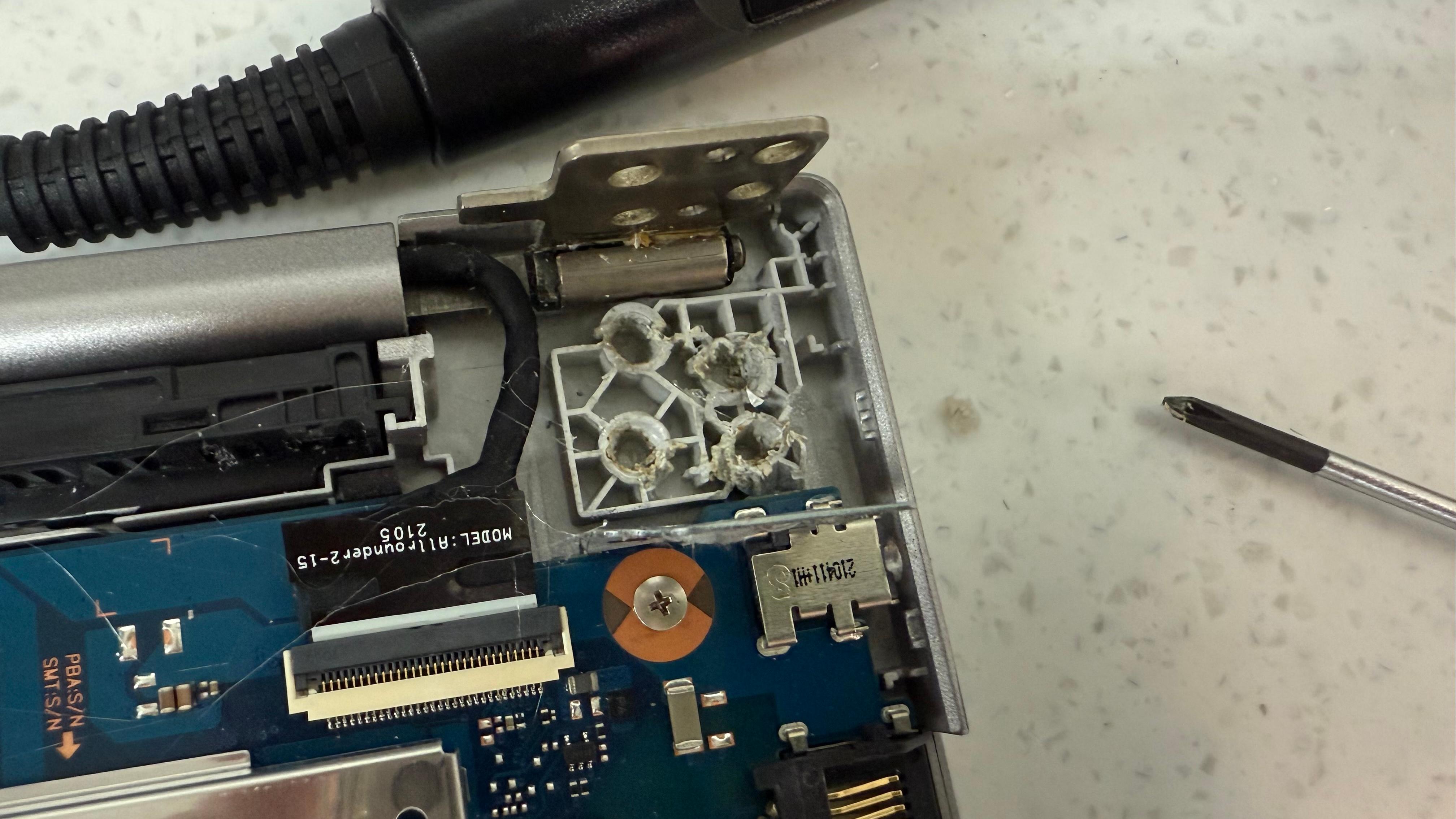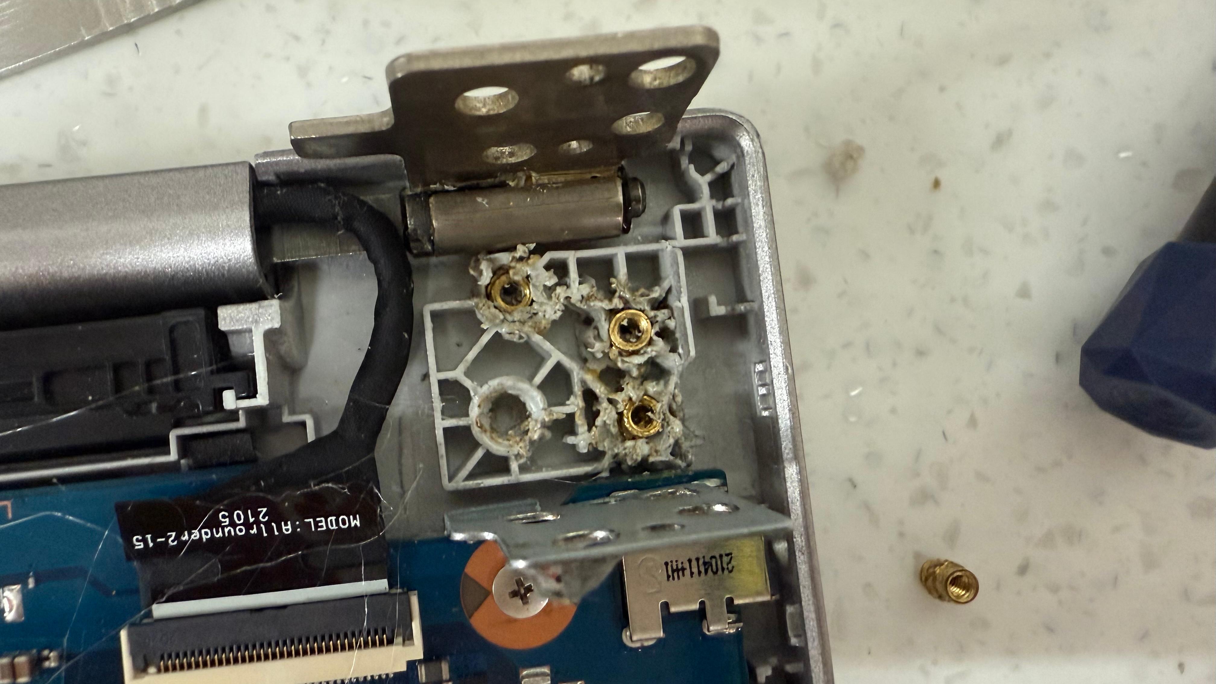힌지 쪽을 다 풀어서 보니 나사를 넣을 수 있는 부품들이 베이스 플라스틱과 분리가 되어서 빠져 나왔다. 1차로 글루건을 사용했다. 임시로라도 쓰라고...근데 역시나 힘을 안받는다. 노트북이 하나 더 있어서 작업은 가능하니 수리 해달라고 했다.