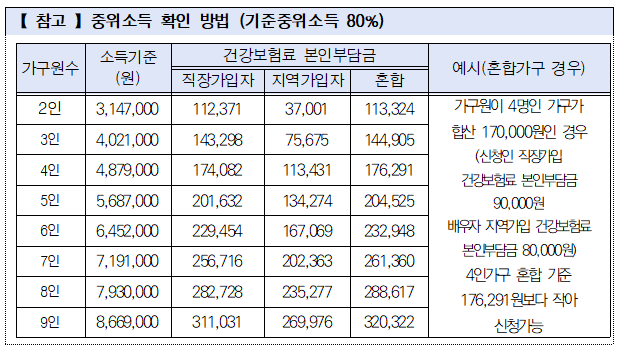 ② 동일 가구원(가족관계증명서 기준)의 소득인정액이 기준 중위소득 51%이상 80% 이하 가구⁕
