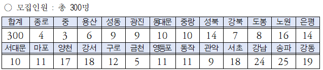 좀 허망한게 다음입니다. 각 구별 모집 인원입니다. 전체 300명 이면 좀 많나 보다 하지만 ㅋㅋ