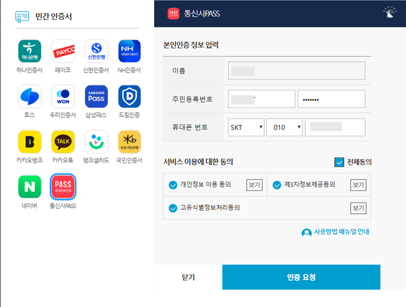 4. 이제 로그인을 합니다. 간편 인증서로 로그인 하면 됩니다. 카카오 인증서로 해도 되고 저는 PASS를 주로 쓰기 때문에 이걸로 로그인 합니다. 서비스 이용에 관한 동의는 반드시 체크! 해야 합니다. PASS 에서만 통신사 선택이 있고 나머지 인증서는 통신사 없이 이름/생년월일/휴대폰 번호만 입력하고, 서비스 이용 동의 체크 해주시면 됩니다.