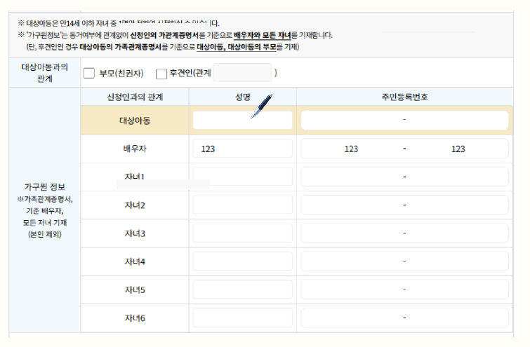 대상 아동 이름과 주민번호를 입력해줍니다.