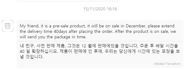 40일 연장 해 달랜다. 알리에서 번역은 그지 같다. 구글 번역인가? ㅎㅎㅎ
