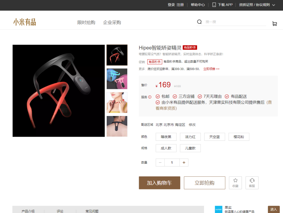 Hipee智能矫姿精灵 有品秒杀 弯腰驼背没气质?智能矫姿精灵,实时监测体态,科学矫正身姿! 促销: 有品秒杀 有品秒杀商品,超出数量不可购买 更多: 底价狂欢迎新年,满300-30,满500-50, 立即领券 >> 售价 ¥ 169 ¥ 199 服务 ! 包邮 三方店铺 7天无理由 有品配送 由小米有品提供配送服务,天津果实科技有限公司提供售后 ( 查看商家资质 ) 配送区域 北京 北京市 海淀区 修改 颜色 暗夜黑 活力红 天空蓝 樱花粉 规格 成人款 儿童款 数量 加入购物车 立即抢购 收藏 客服 产品介绍 评论 常见问题