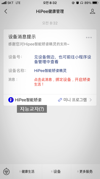 위챗에서 QR코드 스캔 선택해서 매뉴얼에 있는 QR코드를 읽혀주면 hiPee를 팔로우 해준다.