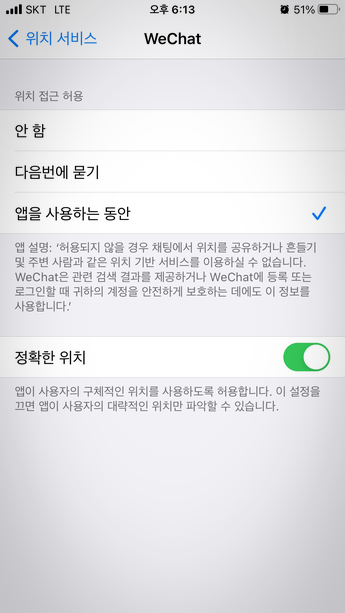 설정 > 개인 정보 보호 > 위치 서비스 > 위쳇 > 앱을 사용하는 동안 을 설정해주면 된다.
