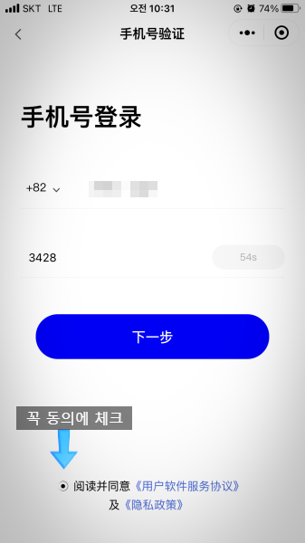 인증번호 받으면 4자리 입력하고 파란색 아이콘을 선택하는데 아래쪽에 동의 앞에 꼭 체크해 줘야 한다.