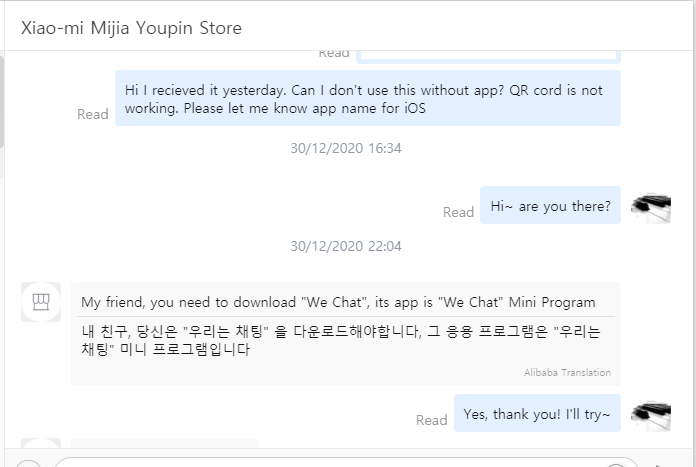 제품을 받고 빨리 쓰고 싶은 마음에 매뉴얼에 있는 QR코드로 접속하니 WeChat이 어쩌고저쩌고... 에잉? 채팅 프로그램이 웬걸?