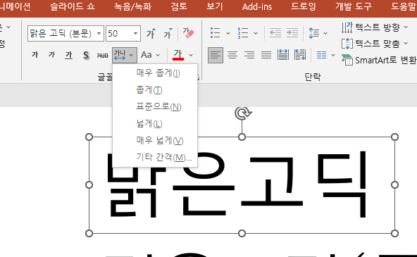 맑은 고딕을 위에서 보면 다른 글씨체보다 글자 간격이 넓다. 이걸 좀 좁게 해주려면 글자 박스를 선택하고 "기타간격"을 선택한다.