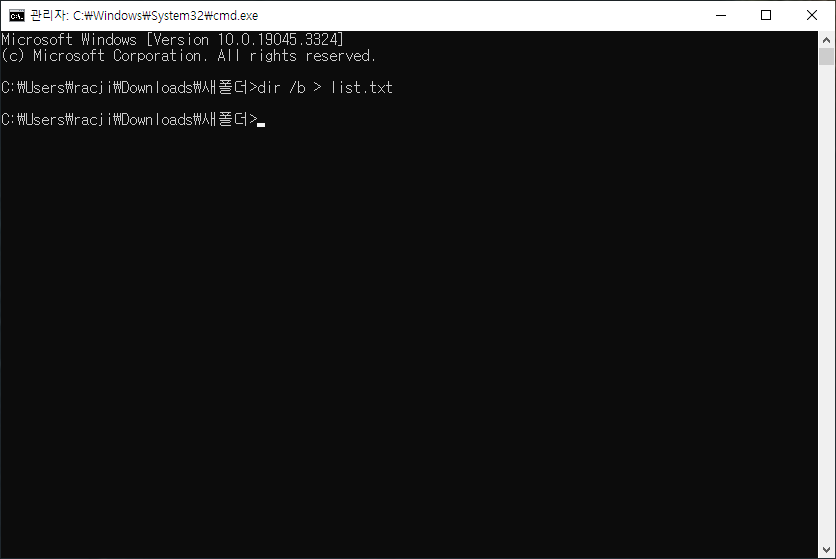 풀더명만 하려면 옵션에서 /ad 만 하면 된다. 빼먹지 말아야 하는것이 " > list.txt" 이다. 이게 이름을 텍스트 파일로 만들어주는 명령이다. 한글로 해도 상관없다. 뒤에 확장자만 맞춰주면 된다.