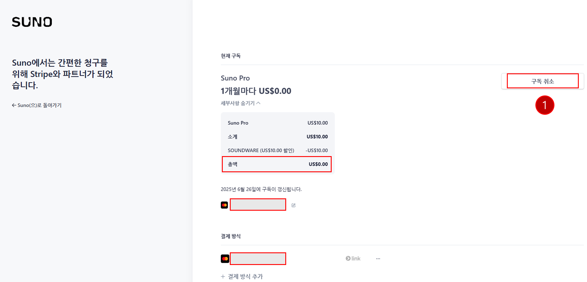 자 여기서 금액 보면 0원이 나오죠. 프로모션 코드가 잘 적용된것 같습니다. 옆에 보면 "구독 취소" 버튼이 있어요. 이를 클릭하면 구독이 해지가 안되고 한번 더 확인 합니다. 근데 2개월 무료인데 바로 해지를 하면 1개월만 무료로 사용가능해요. 2달째 되는 첫날 해지를 하면 2달 이용을 무료로 사용 가능합니다.