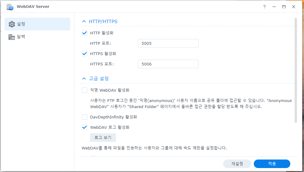 사전에 반드시 외부 액세스 부분이 셋팅이 되어야하고 시놀로지에서 WebDAV를 설정해야한다.