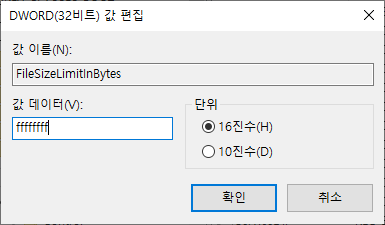 2. FileSizeLimitInBytes 값을 기존값에서 16진수 "ffffffff" 로 변경(8자리) > 전송 용량이 4GB 까지임