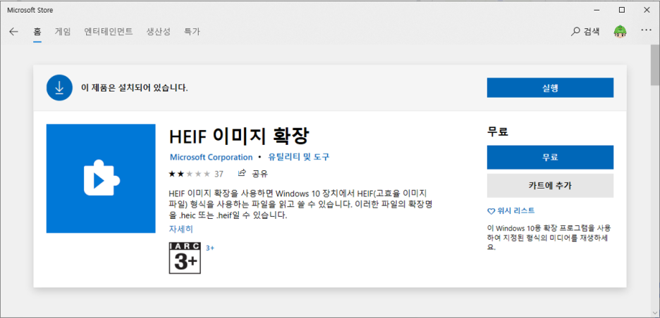 HEIC 이미지를 인식하기 위해서는 Microsoft Store에서 HEIF 이미지 확장 프로그램을 설치를 하면 되고, 저는 미리 설치해놨기 때문에 실행이라고 뜨게 된다.
